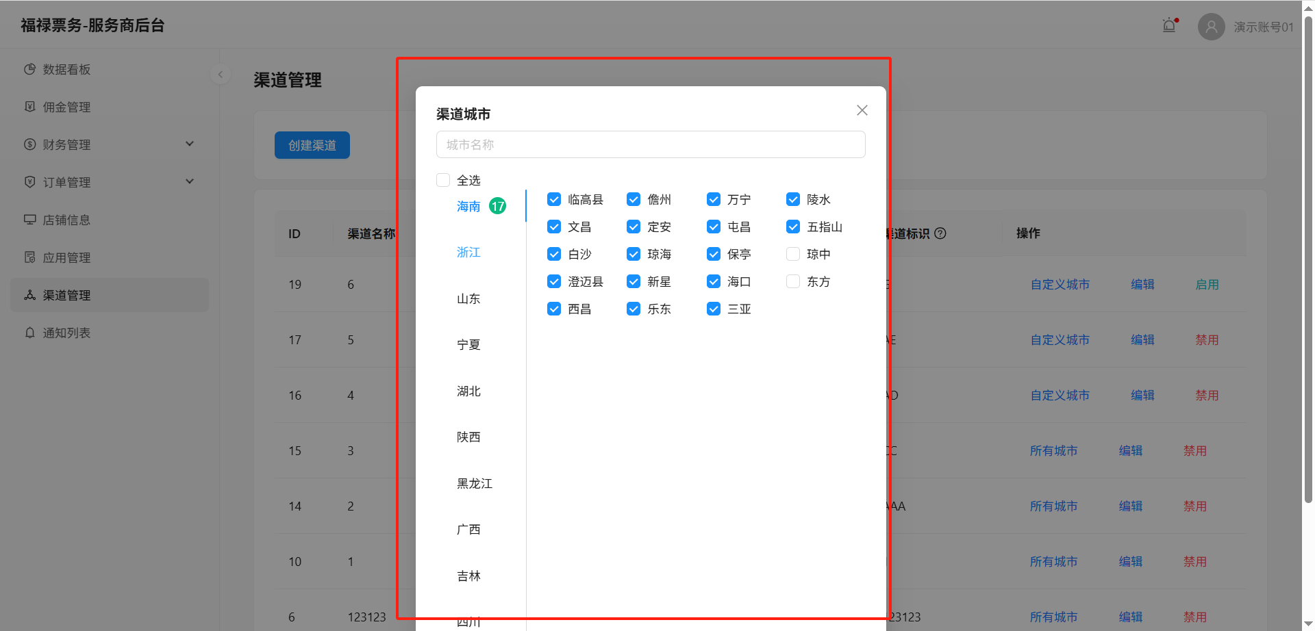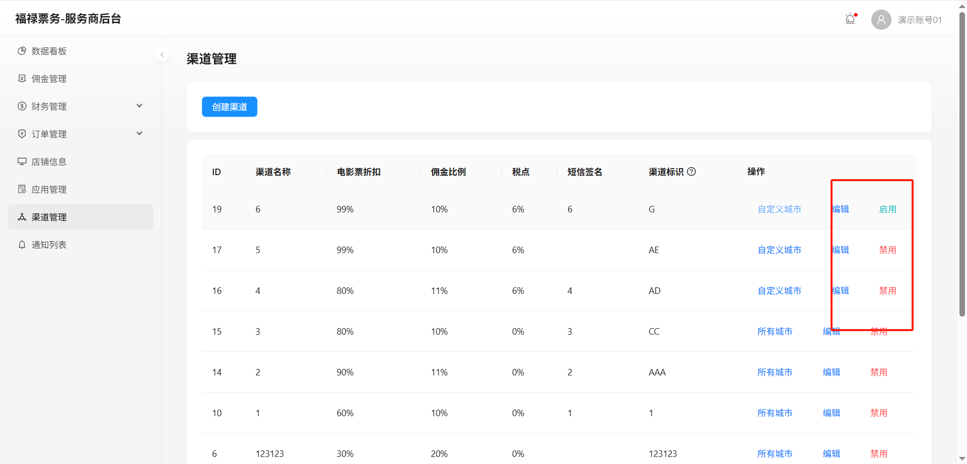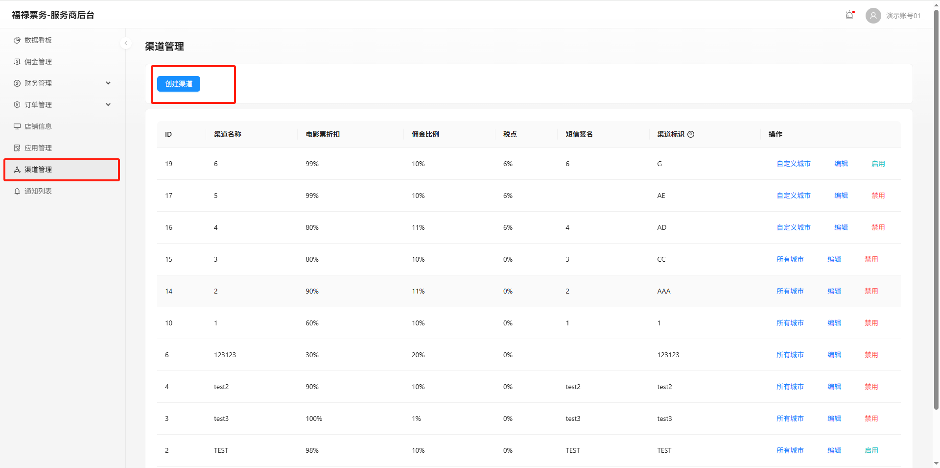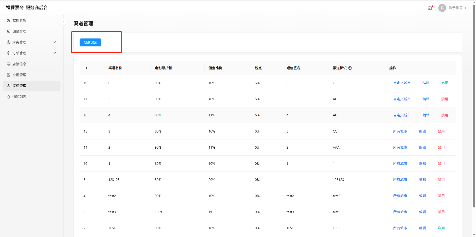 店铺完成认证后需绑定对应的渠道信息对与电影票务销售相关的各种渠道进行管理,包括渠道的添加、编辑、禁用自定义销售城市等操作,确保渠道的正常运行和有效管理,提高票务销售的效率和覆盖面。