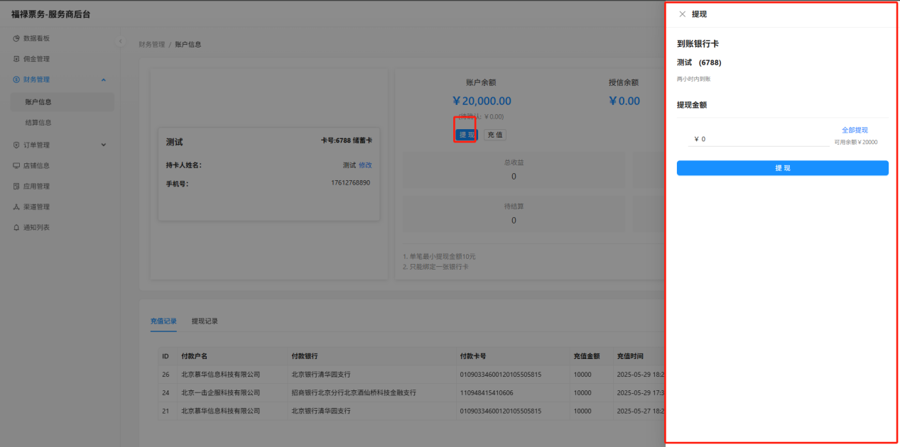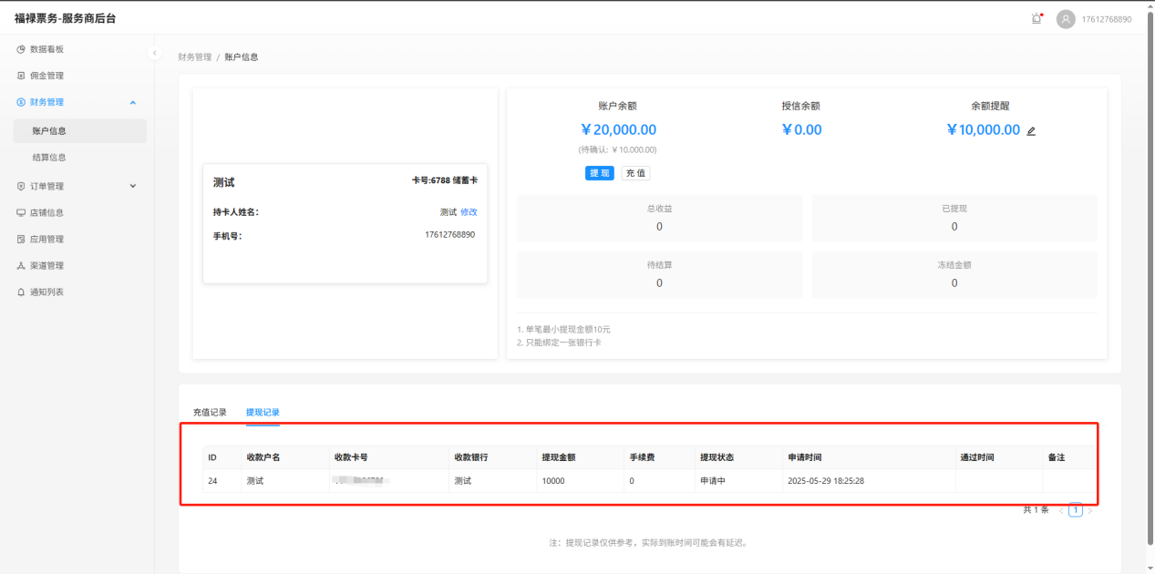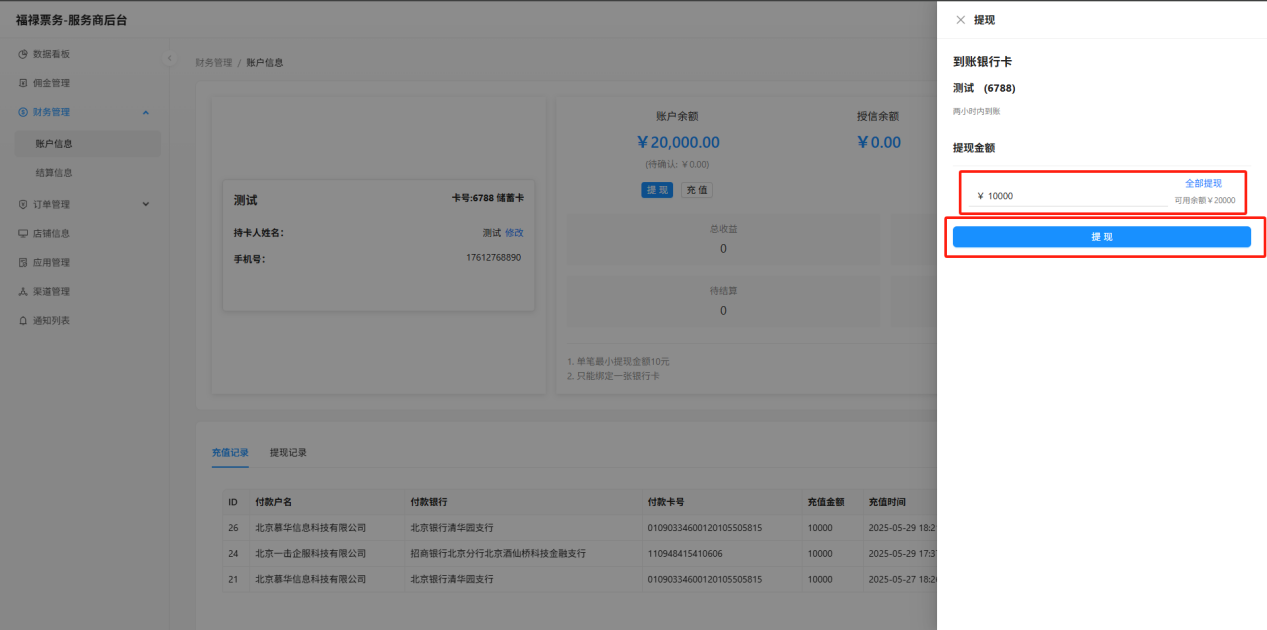 输入提现金额,点击"提现"生成提现记录